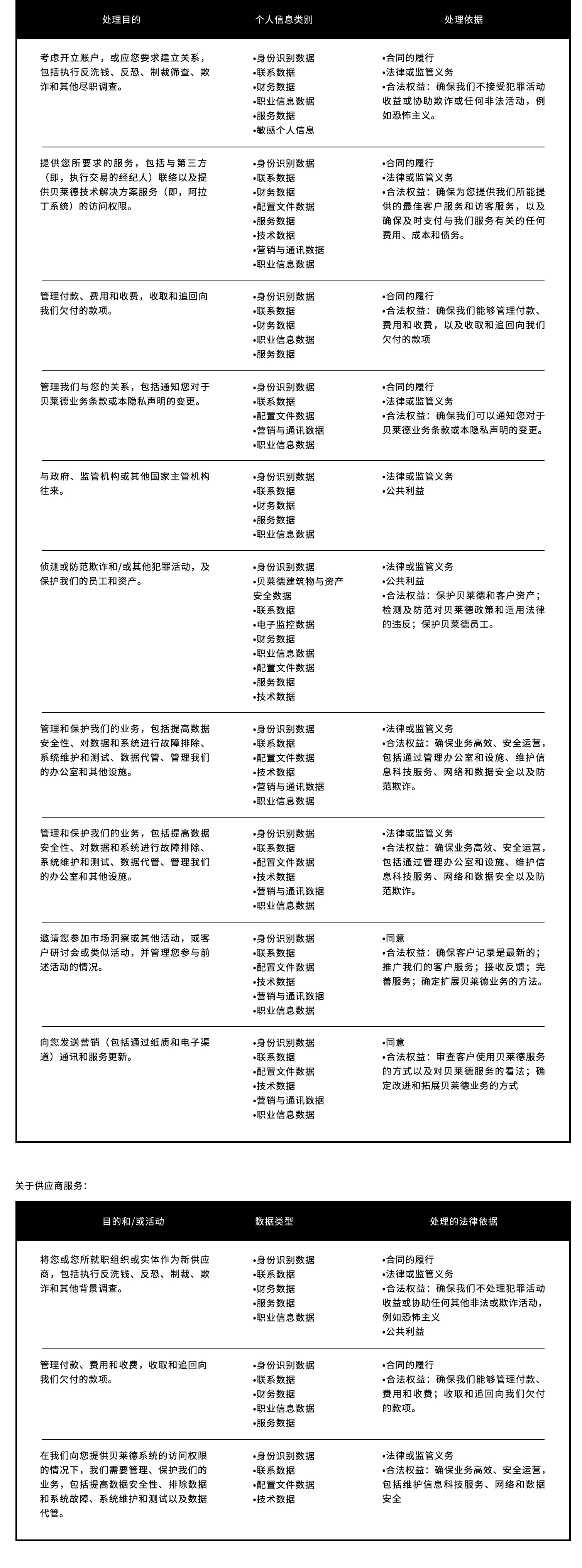 下表列出了我们处理个人信息之目的和依据。